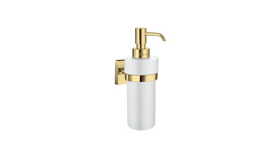 Smedbo sæbedispenser til montering på væg. Selve beholderen er i porcelæn, mens ophænget er i poleret messing