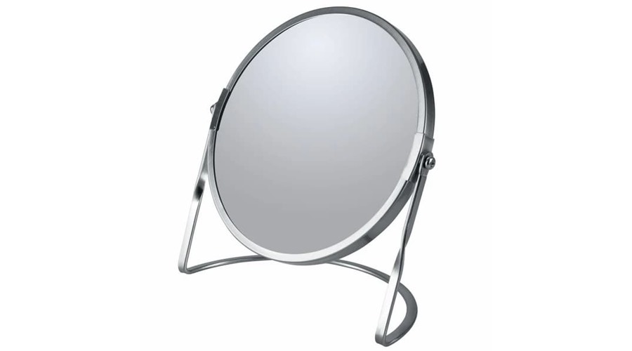 Vendbart bordspejl Akira med x1 og x5 forstørrelse. Fremstillet af glas og børstet stål.