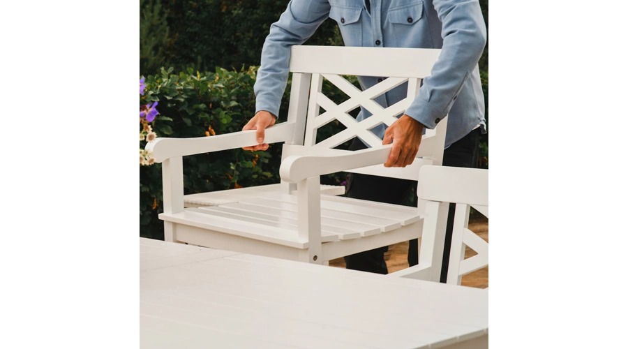 Tisvilde-serien er en harmoniske kombination af klassisk design og funktionelt håndværk. Inspireret af de elegante Patricia-villaer tilfører serien et strejf af tidløs charme. Det karakteristiske kryds i ryglænet fungerer ikke blot som en smuk designdetalje, men bidrager også til både stil og komfort. Tisvilde i mat hvid kræver minimal vedligeholdelse – blot en aftørring med en fugtig klud.