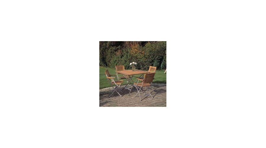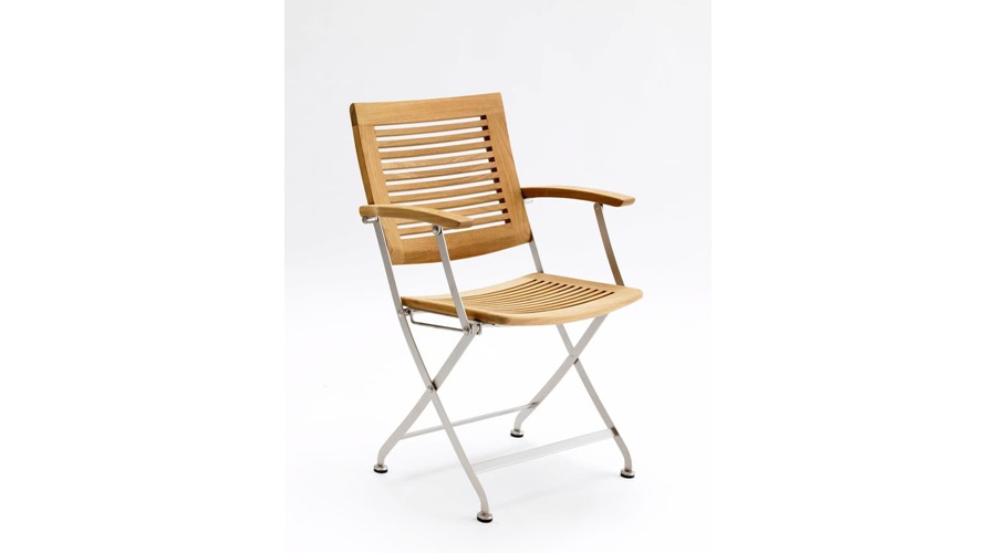 Elegant klapstol i teaktræ med armlæn. Konstruktionen i rustfrit stål giver stolen et let udtryk.