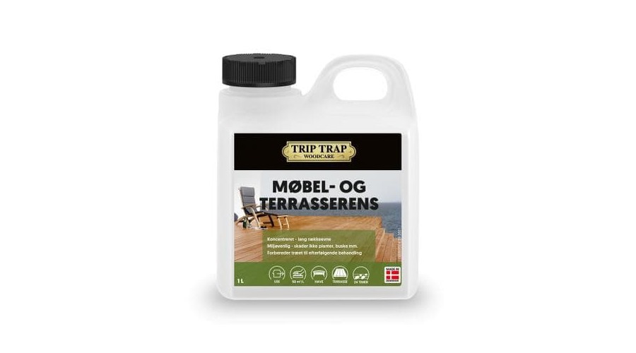 Møbel- og Terrasserens er udviklet til grundrengøring af alle former for træoverflader, som fx terrasser, havemøbler, hegn, udhæng, døre og vinduer. Produktet opløser hurtigt og effektivt snavs, og sikrer derved en optimal overflade for efterfølgende behandling. Produktet er miljøvenligt og skader ikke planter buske mm.