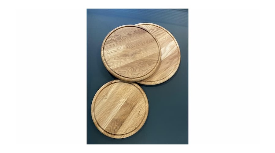 Rundt skærebræt i egetræ med saftrille. Også velegnet til pizzaer og tapasservering. Skærebrættet er lavet på et dansk snedkerværksted.