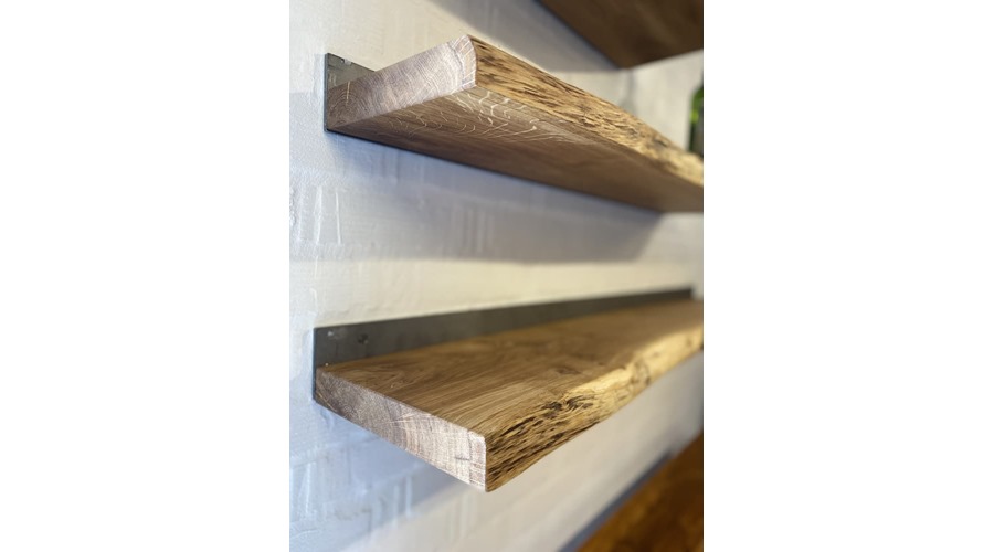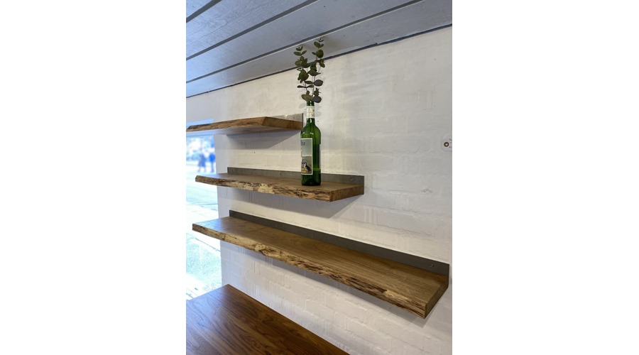 De rustikke egetræshylder har vi fået produceret efter egen ide i samarbejde med en dansk snedkervirksomhed. Hylderne er 100 % danskproducerede i dansk egetræ og der er ikke to hylder, der er ens.