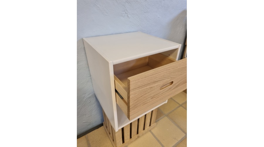 Haslev natbordet er special lavet til os i Huset Holst, i et stilrent design, i hivdmalet bøg, og en skuffen i Eg.
