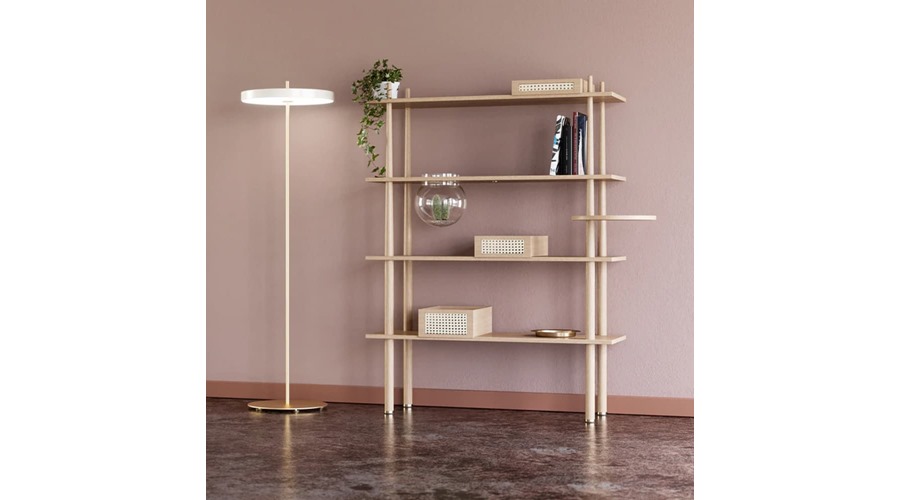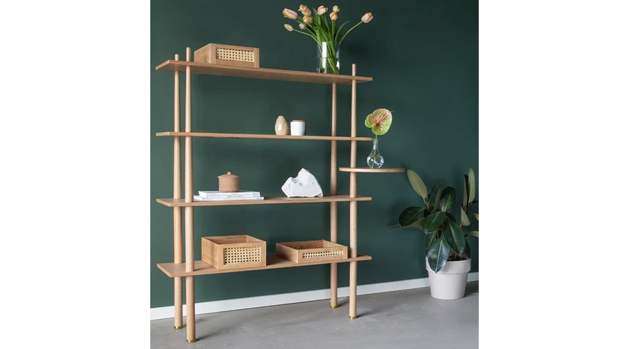 Stories reolen er en fleksibel reol, hvor du kan udstille de ting, du holder mest af. Stories består af 4 hylder, hvor den ene hylde har et hul med en messingplade til dine småting.Stories kan udbygges til den størrelse, du har brug for, og kan gøres personlig med vores forskellige Stories-tilbehør, som eksempelvis en glasskål, ekstra opbevaringsbakker og et sidebord.Stories er lavet af eg og har et simpelt udtryk, der med sine fire koniske ben, skaber et let og raffineret udseende. Reolsystemet leveres med fire messingfødder, der kan justeres så de passer til de skrå gulve, der ofte kan findes i gamle lejligheder i København.