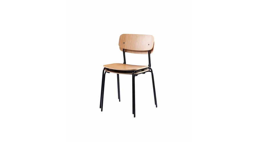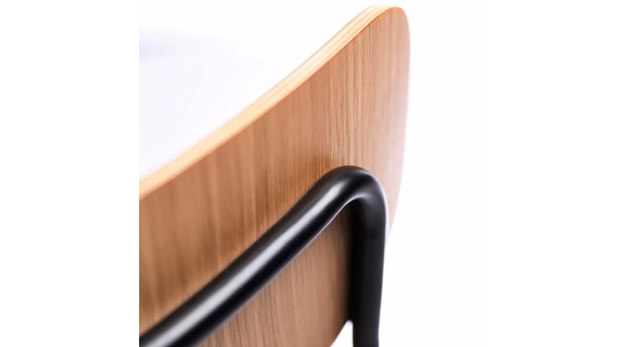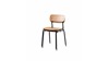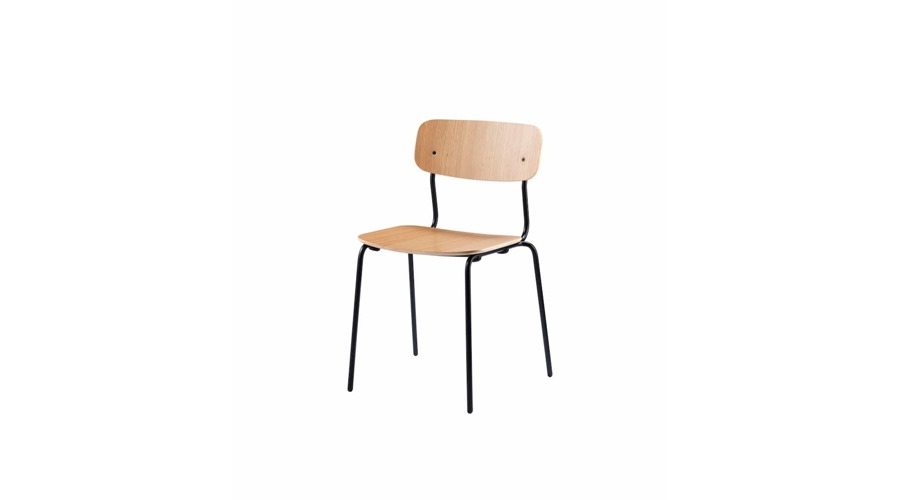 Stolen er lavet i ege finér og pulverlakeret sort stål, med polstret sæde.