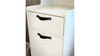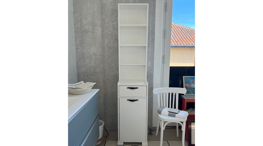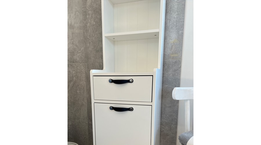 Hvidt højskab med hylder og to skuffer med lædergreb.