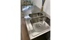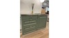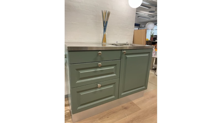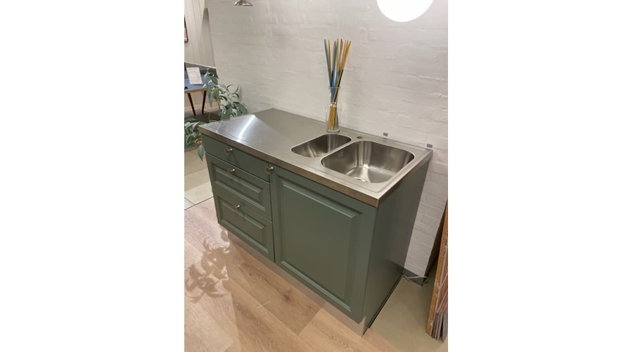 Tekøkken fra Tvis i en smuk havgrøn farve med vask og bordplade i ét, i rustfri stål.